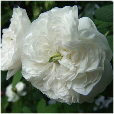 純白の細かな花びらがロゼッタ咲きとなり、グリーンアイがとても引き立ちます。多くの人が「オールドローズの中で一番美しい」「白バラの中で一番美しい」と評価する大変人気のある品種です。強香種。葉は明緑色で、上に向かって花芽が伸び、半つる性の樹形をしています。適度な剪定を施しシュラブのような仕立て方をしてもよいでしょう。作出者のハーディはマルメゾン宮殿の有名な庭師で、このバラは夫人に捧げられたものです。