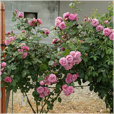 ライラックピンクから深い藤色の花色。「コルデス・マゼンタ」とも呼ばれる、特徴ある色合いです。開ききるとロゼット咲きになることもあります。房になって咲くので、花の重みで枝が垂れ咲くこともあります。花枝が長く、切花としても有用です。長く伸びた枝は、冬の剪定で整えてもよいですし、長い枝を生かして半つるのバラとして扱っても良いでしょう。良い香りを漂わせます。